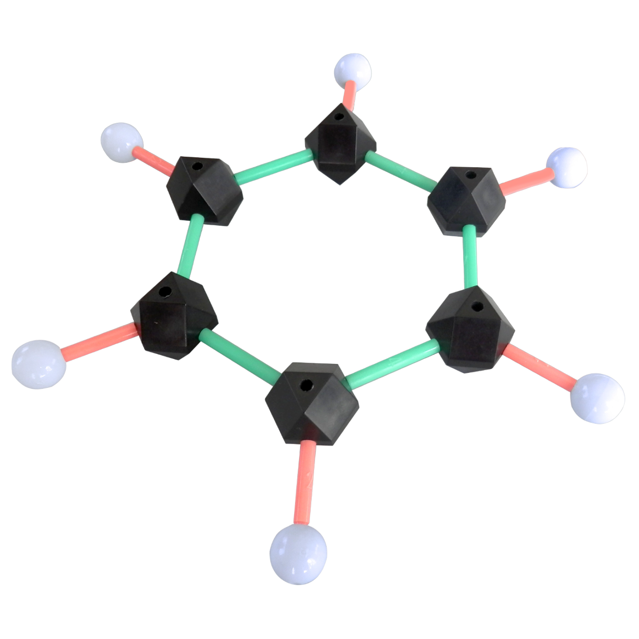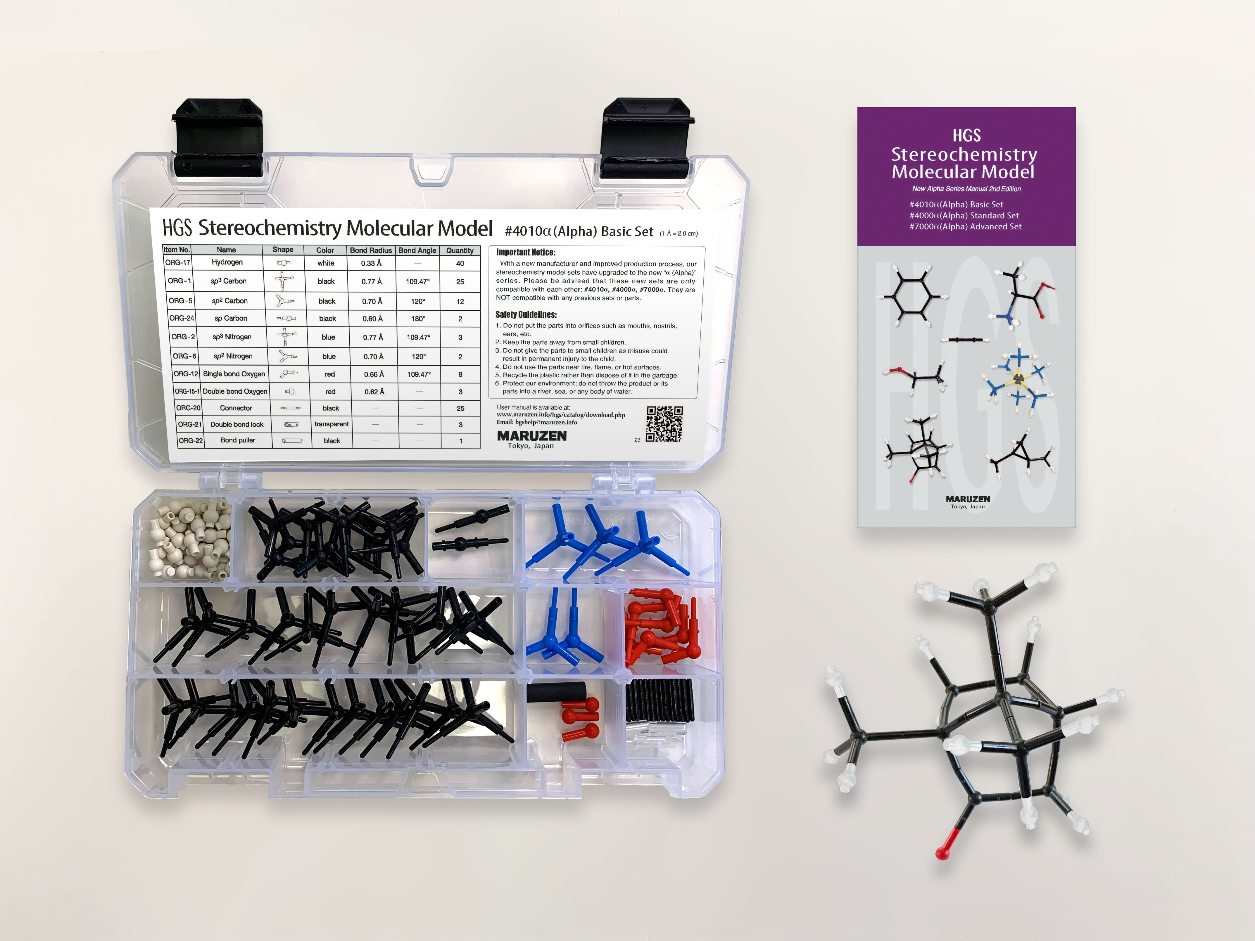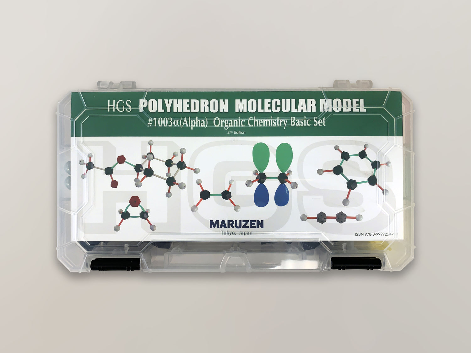 This is the organic chemistry basic set of the polyhedron molecular models. This set contains most atoms and bonds used for constructing most organic compounds such as alkanes, alkenes, alkynes, aromatics, alcohols, ketones, esters, amines, amides etc. In addition, P, S, and octahedral metal atoms are also included, and hence it is possible to construct compounds containing such atoms.