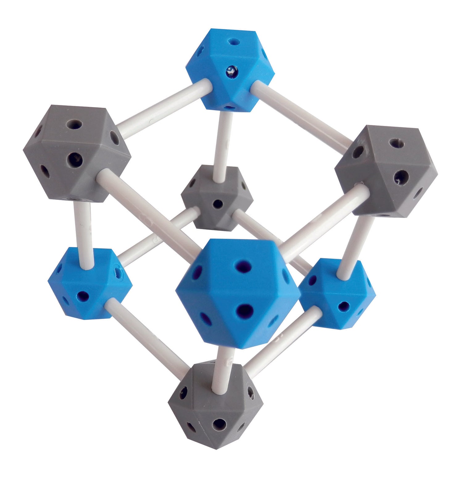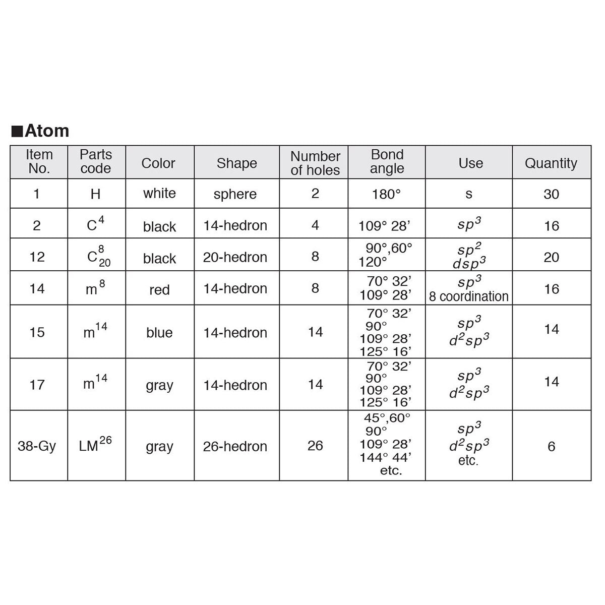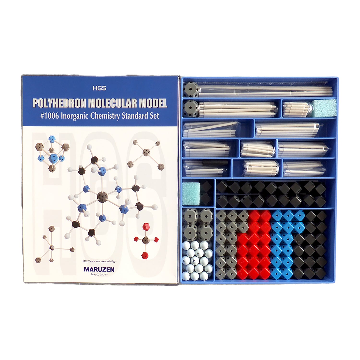 This is a standard set for research on molecular structure and crystal structure of inorganic compounds. Suitable models of complicated tetra-, penta-, and hexa-coordinated metal complexes and chelate compounds can be readily constructed. Interatomic distances can be easily estimated by using the Å unit scale (1 Å = 2.5 cm) provided. Fundamental structure of ionic crystals such as rock salt, cesium chloride, zinc blende, wurtzite, fluorite, and perovskite types, in addition to graphite and diamond types, can be constructed without supplying any supplementary parts.