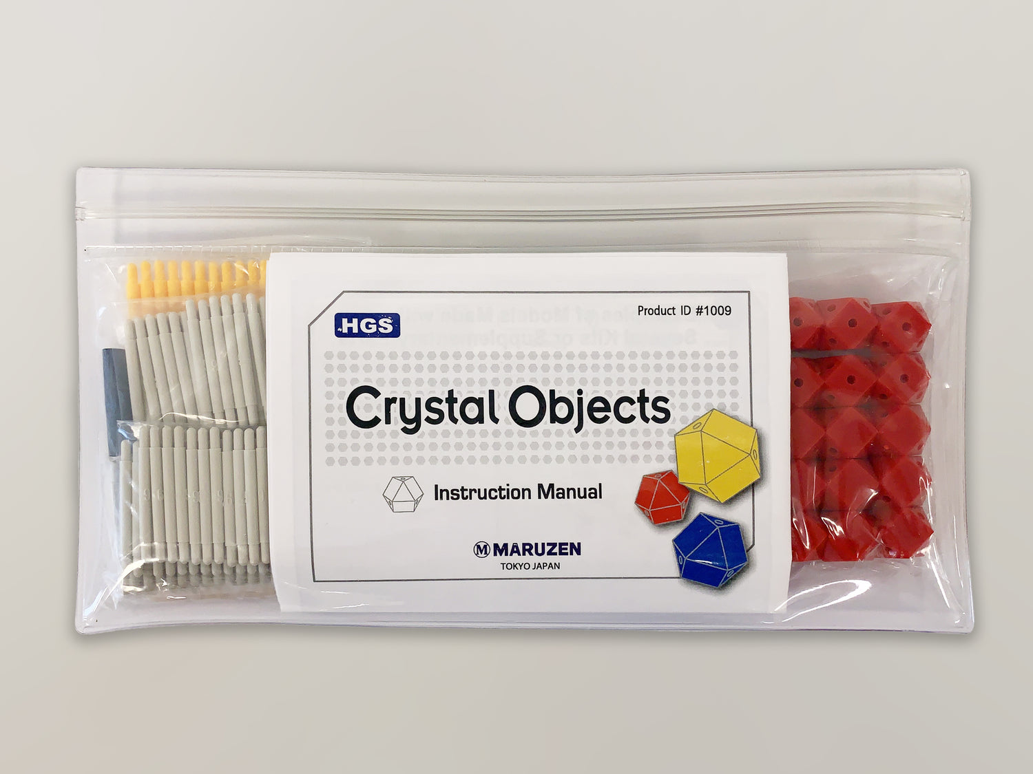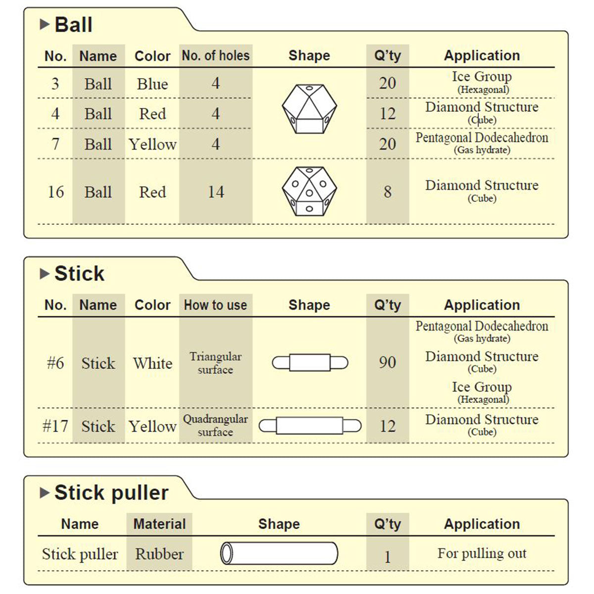 "Symmetry" is a very important concept in art and science. The word “symmetry” has been used for describing something that is “bilaterally-symmetric,” “beautiful,” or “well-balanced” since a long time ago. Therefore, it is obviously an important concept for paintings, sculpture, and even music. This word is also a very essential concept in math, physics, chemistry, and biology. This set is useful for learning the concept of symmetry by making various crystal and molecular models with high symmetry.