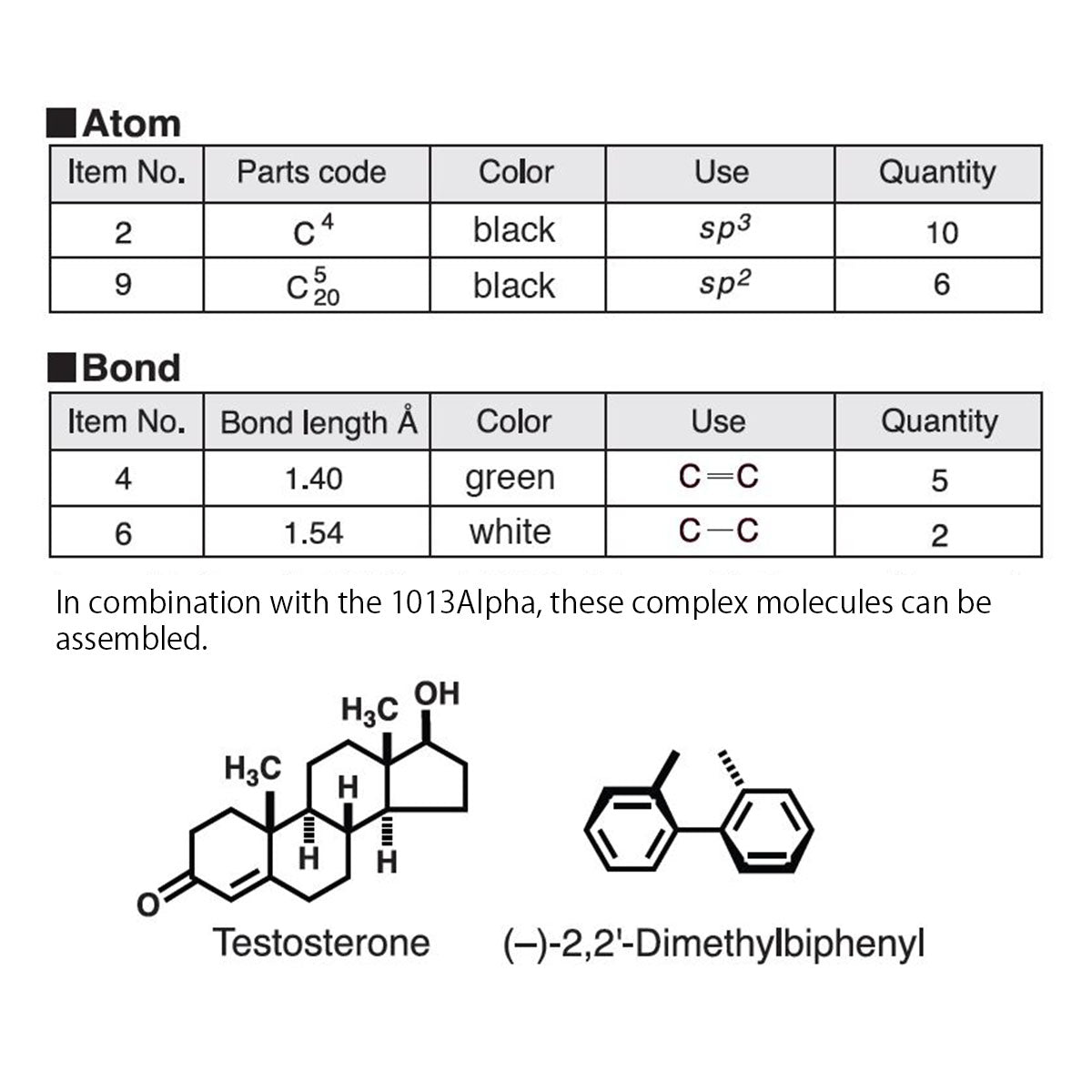 This is the supplementary set for the 1013Alpha Organic Chemistry Set for Student. When the atoms and bonds of the 1013Alpha Organic Chemistry Set for Student are not enough for constructing large molecules, it is suggested to use the present 1013S Alpha Supplementary Set also. By combining these two sets, it is possible to construct large molecules, like steroid compounds.